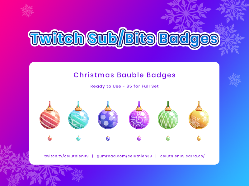 You will receive a ZIP file that contains 6 badges in 3 sizes each (72x72px, 36x36px & 18x18px). You can use them on your Discord server, Twitch channel or any other platform you wish.